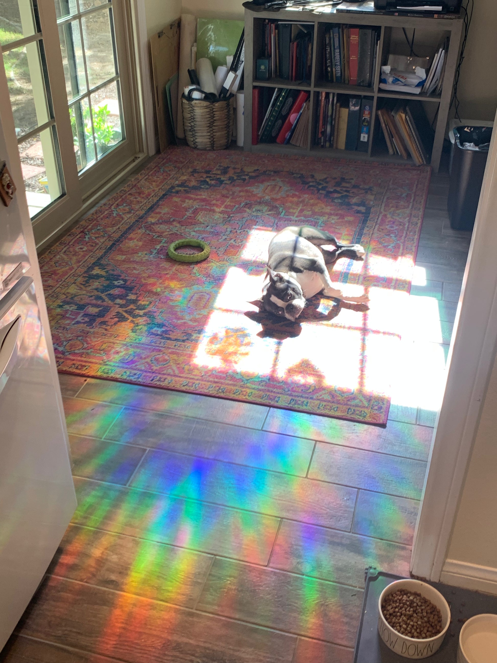 5”x8” or 7”x 11” inch window cling sun catcher. When placed in direct sunlight, the holographic cling will project rainbows into your home.